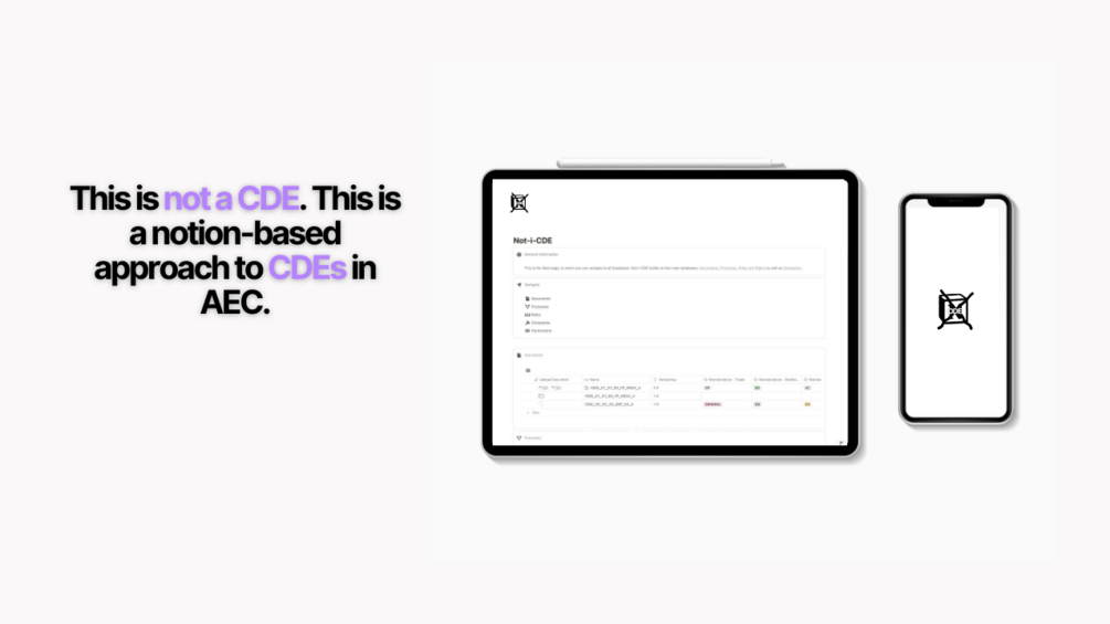 - Are there any additional costs? No, Notion is free for individuals. There are paid plans, but you can start using Not-i-CDE with a free account on Notion, although i would recommend a paid plan (the smallest one is perfectly fine), as AEC projects demand the ability to upload files > 5MB. The costs compared to a standard CDE solution are still quite small.